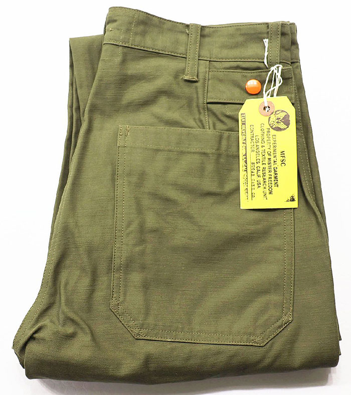 1950年代の米空軍ユーティリティトラウザーをベースに、特徴的な両脇のスナップボタンやアシンメトリーなバックポケットといった意匠は踏襲しつつ、現代的にアレンジを加えた一本。腰ポケット部のタックを省いてシルエットを再構築し、両脇に配されていたツールポケットは左内膝部分のみに移設しています。 生地はムラ感とスラブ感のあるオリーブ・コットンバックサテンを採用しています。 | |